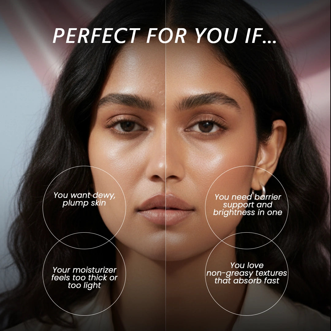 This feather-light formula melts instantly, leaving your skin feeling plump, soft, and dewy - never greasy or sticky. It strengthens your barrier, balances oil, and gives your skin that naturally fresh, well-rested feel all day long.