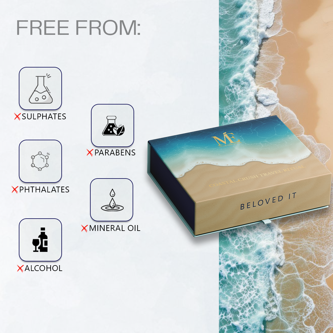 The Coastal Crush Ritual is Miloé’s travel kit designed for sun, salt, and humidity. It hydrates without heaviness, shields your skin from harsh rays, and restores freshness after long days by the sea — keeping your glow soft, balanced, and beach-ready.