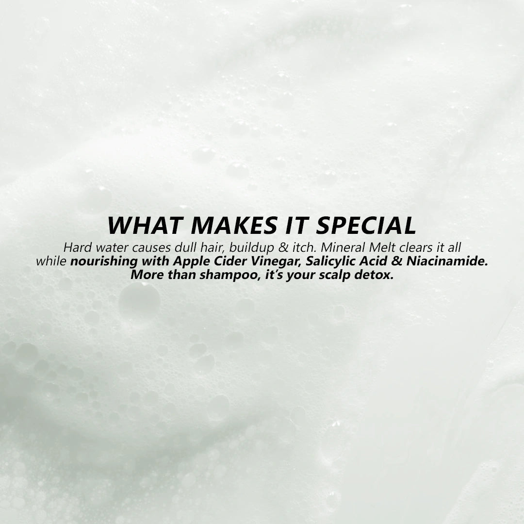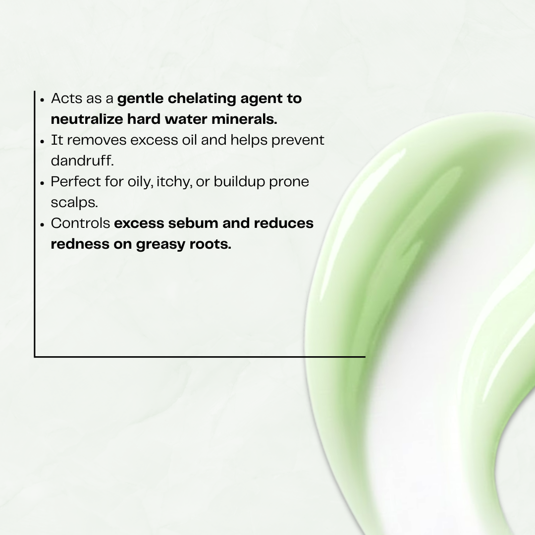 It uses Sodium Gluconate–driven chelation, ACV, and Salicylic Acid to dissolve Ca/Mg deposits, unclog scalp buildup, and reduce dandruff caused by mineral-heavy water.
