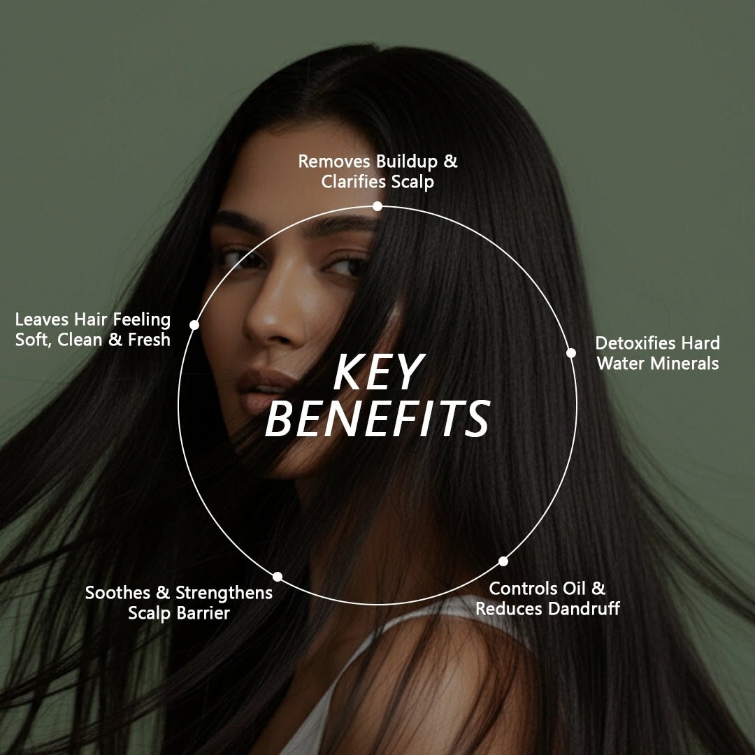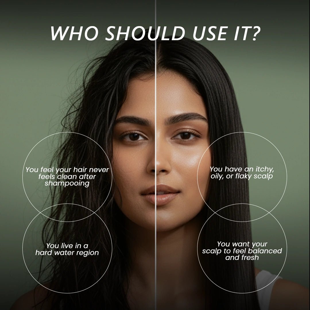 Neutralises mineral-heavy water (Ca/Mg), clears scalp buildup, controls dandruff, and restores softness - engineered specifically for Indian hard water conditions.