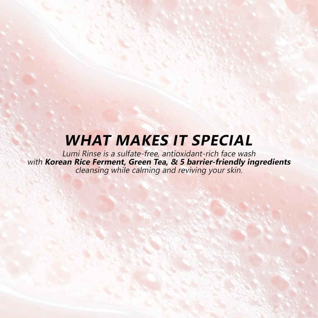 Lumi Rinse cleanses without dryness, supports a healthy barrier, and calms irritation and fatigue.