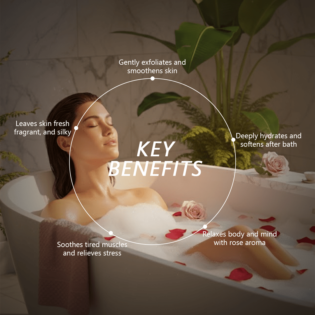 The tender fragrance of roses lingers in the air, melting away the weight of the day, while the soothing textures and natural formulations nourish both body and spirit. As the warm embrace of rose essence surrounds you, it quiets the restless mind, inviting peace, balance, and serenity back into your being.
